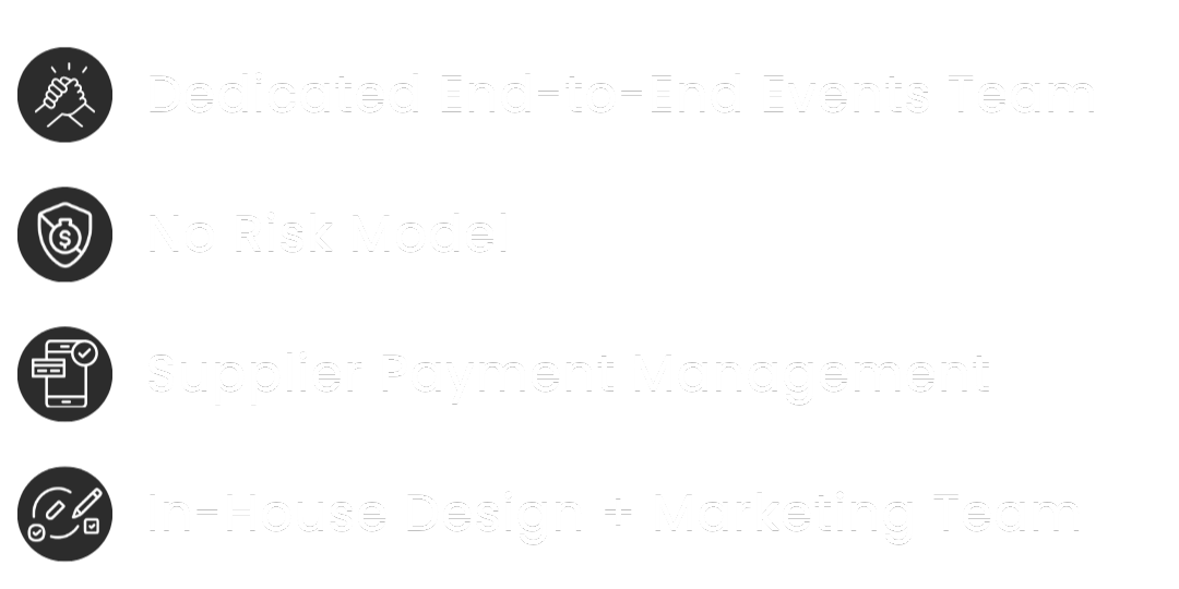 Our end-to-end execution covers every detail, from strategic planning and creative development to venue sourcing, vendor coordination, guest communications, on-site logistics, and post-event follow-up. Whether it’s an intimate gathering or a large-scale activation, we ensure a seamless experience that engages your audience and leaves a lasting impression.