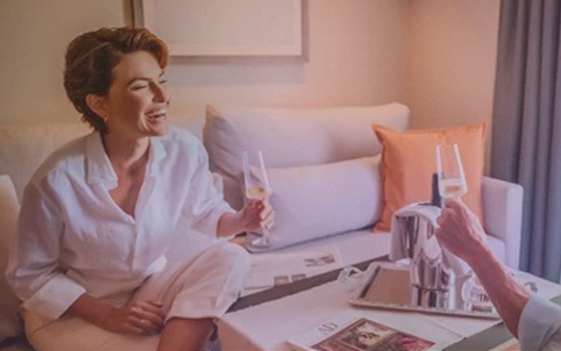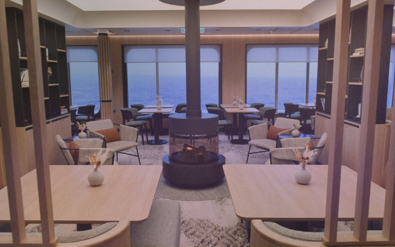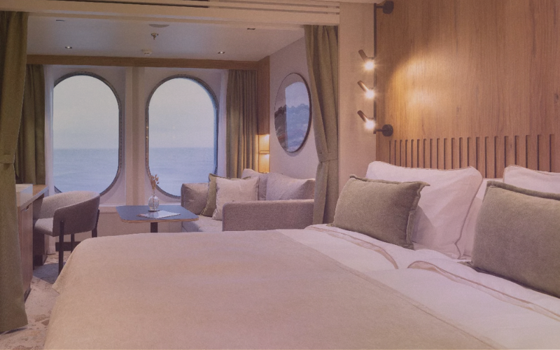 All cabins are ocean-facing suites for up to two guests with two single beds or a double bed, a bedroom and living area, a flame-effect fireplace and a luxurious bathroom; the Love Suite, which adds a private balcony to the same layout and amenities; the Balcony Suite, featuring a more spacious and elegant design while retaining all comfort features; and the After-Party Suite, a premium stateroom with high-end fixtures and finishes which is the perfect hosting pad.