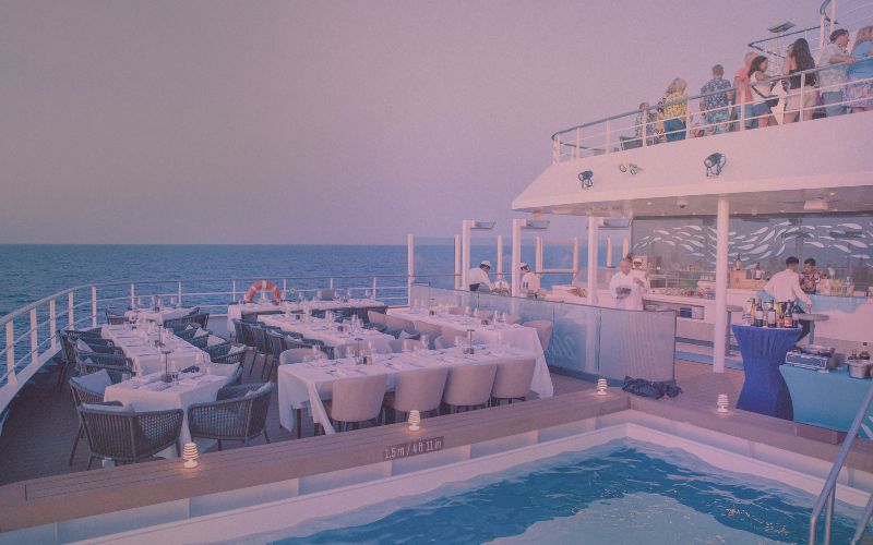 Each night, after a day of island adventures, enjoy a gourmet dinner with our private chefs back on the boat before delicious evenings of different theme parties.